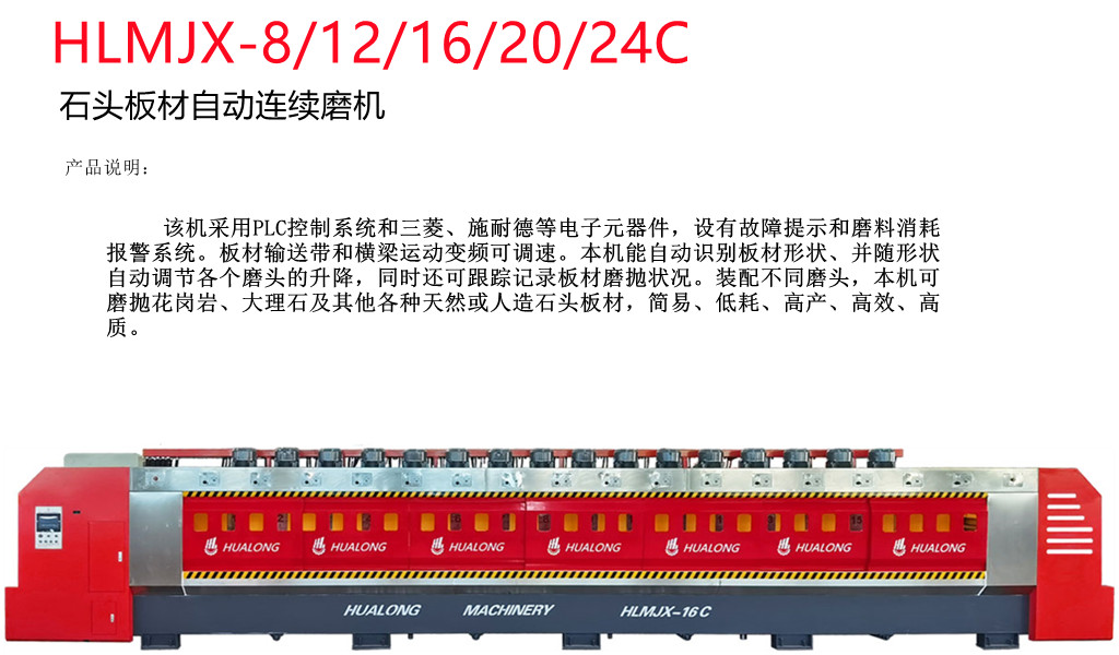 HLMJX-16 型自動石材板材連續(xù)拋光機(jī),配備多個樹脂盤頭和 PLC 控制系統(tǒng),能夠連續(xù)自動地對板材進(jìn)行研磨和拋光,是花崗巖等硬質(zhì)石材表面處理的理想選擇。安裝不同類型的頭,它也非常適合大理石、石英巖和其他石材板材的加工。