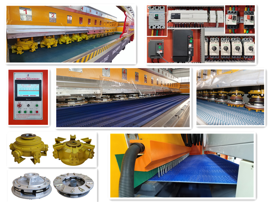 HLMJX-16,equipped with multiple resin disc heads and PLC control system, can grind and plolish slabs continously and automatically, is perfect for surface finishing of hard stone such as granite. Mounted with different type of heads, it’s also great for marble, quartize and other stone slab finishing.