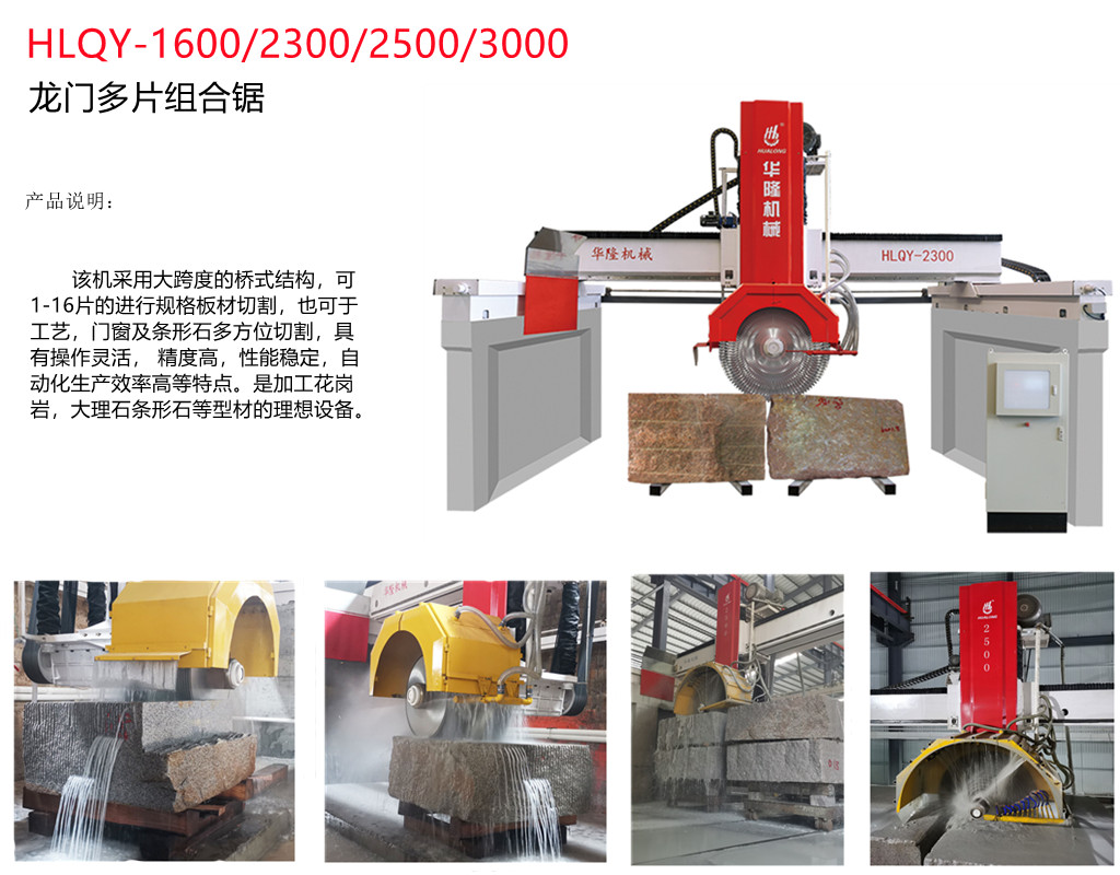 HLQY-2500 龍門多片組合鋸是一款經典且實用的橋梁鋸,可用于將石塊切割成薄片或厚片。它采用西門子 PLC 控制系統,配有油浸式直線導軌。最多可安裝 18 片薄鋸片。